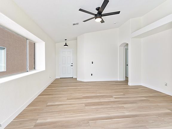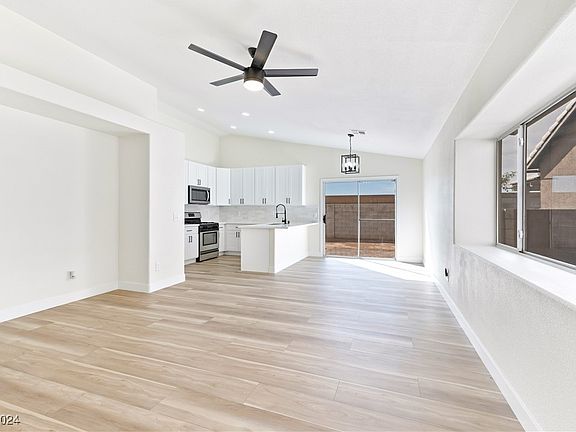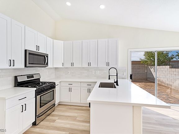 Enjoy this newly remodeled, single-story home with 3 bedrooms and spacious backyard. Located minutes from the North Las Vegas Airport.  Home has gorgeous interior finishes, open floor plan,  vaulted ceiling,  washer/dryer hookups, plush carpet and laminate wood flooring throughout. Customary kitchen with garden view,  tiled backsplash, white shaker cabinets with black hardware, stainless steel appliances, and breakfast bar with sitting area. Modern bathrooms include dual vanities with framed mirrors and custom lighting, tiled shower with rainfall shower heads and separate soaking tub in primary.