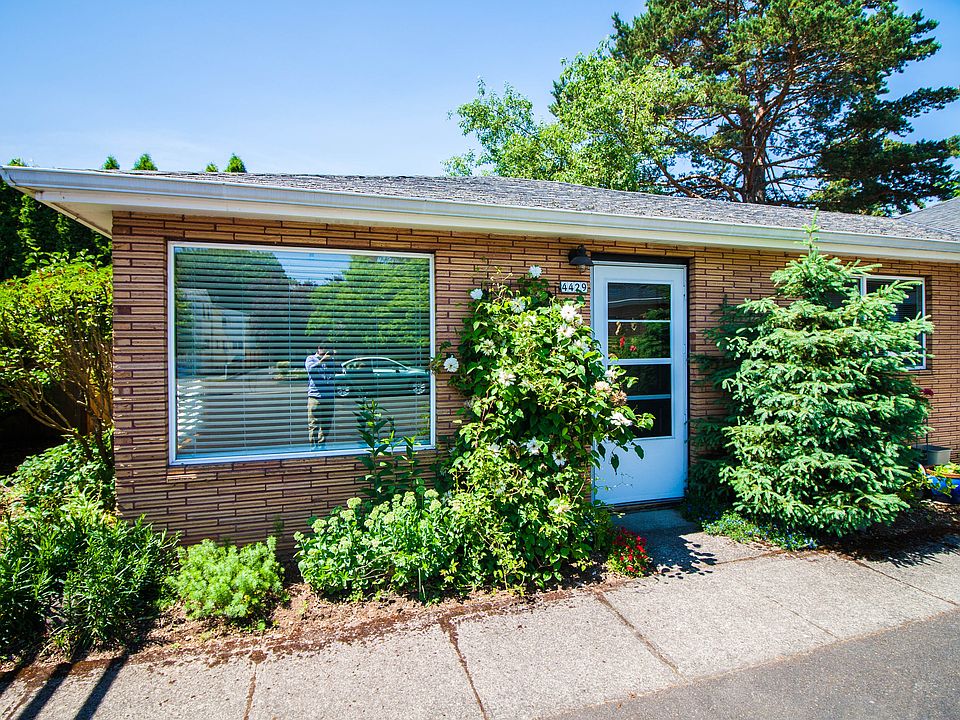Adorable mid-century condo in the community-oriented Nadia Grace Condominiums where modern meets vintage! Light-filled END unit has windows on 3 sides, spacious rms, hardwd floors, in-unit W/D. Private, fenced backyard w/ patio. Gardens on three sides! Parking space in front of unit. No stairs into this ground level home! Fantastic location in Creston/FoPo 'hoods just steps to coffee, restaurants/brewpubs, natural grocery, parks, bus stops, bike lanes. Perfect for the young & the young at heart! [Home Energy Score = 7. HES Report at https://rpt.greenbuildingregistry.com/hes/OR10185599]