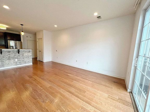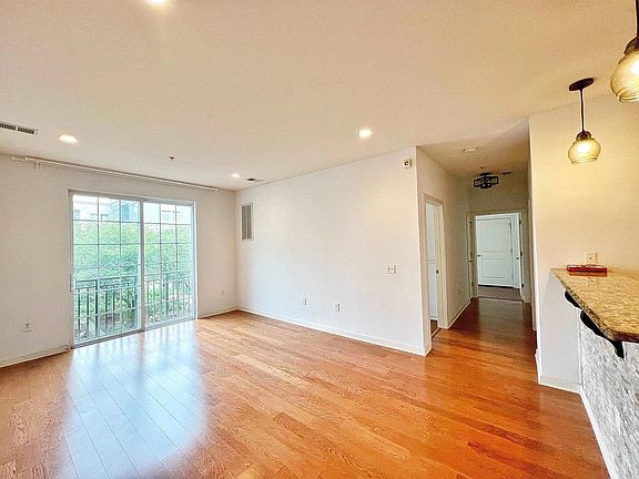 Step into this stunning southeast-facing, 1,200 sq. ft. corner condo unit, where natural light floods the space through the enormous floor-to-ceiling windows that open to a Juliet balcony. The unit features a generously sized kitchen equipped with stainless steel appliances, granite countertops, and ample storage, making it perfect for cooking enthusiasts. The expansive floor plan offers a versatile main living area, ideal for entertaining guests and enjoying meals. Hardwood floors, central air conditioning, in-unit washer and dryer, a luxurious jacuzzi tub, and a walk-in closet provide comfort and style throughout. Located in a recently constructed elevator building, this condo comes with 1-car garage parking, bike storage, and a storage locker. Residents can relax in the beautiful outdoor courtyard, a serene escape in the heart of the city. Situated in an ideal location, you'll be within walking distance to the Grove Street PATH, buses, dining, and shopping. This condo truly combines luxury living with the convenience of city life.