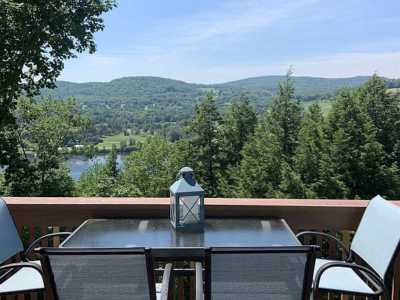 Impeccably maintained end unit condo with one of the finest views in all of Quechee! Large wrap around deck with panoramic views of the Lake, Golf Course, Ski Hill and Country Club below. Two large Master Bedroom suites on each level of the condo. Enjoy the beautiful views from the deck of the on site swimming pool.