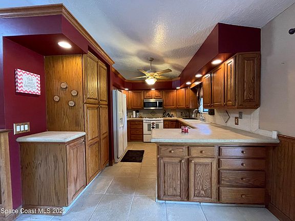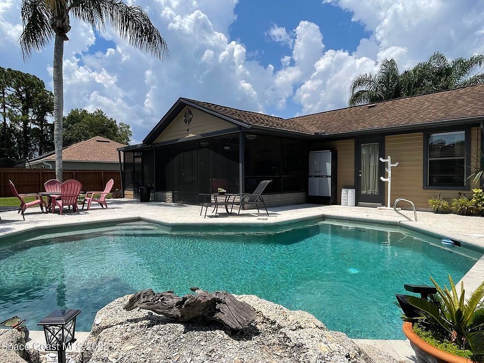 Tropical Paradise in Palm Bay! Amazing pool home with a resort feel. Excellent home for entertaining with upgrades throughout. The master bedroom has a large walk-in closet with custom shelving, and an amazing bathroom with oversized tub and shower. A 4th room is currently being used as a study with built in wood cabinets. The kitchen counters are solid poured concrete, and the kitchen has lots of cabinets and storage space with a service window to the patio. The tropical landscaping and yard are meticulously maintained and accented with landscape lighting. Newly installed, is a brand-new board on board painted and sealed fence. Sit on your enclosed screen patio while drinking coffee as you gaze out over your tropical oasis and sparkling pool. Bring your vacation home! Call today. 2022-08-09