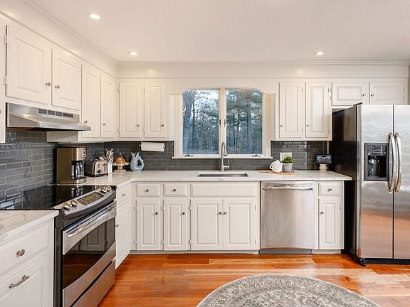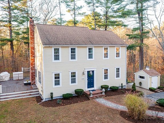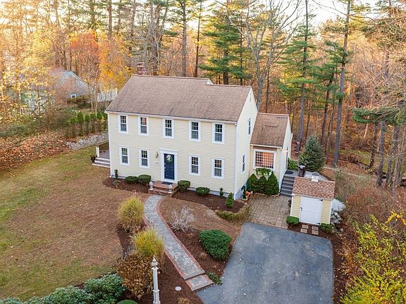 Nestled at the end of a long private driveway, you'll discover this stunning and stylish residence. A brick walkway flanked by lush-landscaping leads you into the heart of the home; featuring a timeless and elegant formal living room, dining room, and adjoining family room, warmed by a cozy Travertine fireplace - perfect for family gatherings! The sun-porch is filled with natural light for relaxing afternoons. Gorgeous modern kitchen has custom white cabinetry, quartz countertops, back splash, stainless appliances, and a pantry. Upstairs, has three generously sized bedrooms, including the primary suite and a full bathroom. Expansive lower level offers a finished playroom, gym and office. This 1.75-acre lot provides ample size yard and picturesque views of the footbridge over a stream and conservation area. Conveniently located, just minutes from Derby Street Shops, Rte 3, the commuter rail, and schools. Ready to move-in and celebrate the holidays - Love Where You Live!