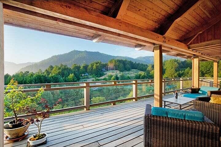 Rare old-growth redwoodFlowing koi pondRadiant heat flooringCozy wood stoveCustom-milled douglasfirRich walnut