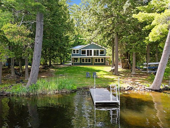 LOVEJOY POND With a top-to-bottom renovation just completed, this year-round 3BR/2BA home dazzles with so many custom touches! The thoughtful updates include opening up the central living area for an open kitchen/dining/living space with lake views opening to the tiled deck. Luxury kitchen will please any home cook with an Italian Fisher & Paykel gas range, gorgeous counter to ceiling tile backsplash, coffee nook with marble tile & maple shelving, an extra-large island with butcher block top, storage & ultra-quiet dishwasher while dining area has a built-in cushioned banquette bench with storage & a built-in credenza with butcher block top. Living features vaulted v-notch pine ceilings, floor to ceiling windows, vertical wood wall panelling & built-in shelving. On the main level is a cozy family room with lake views, a Murphy door with secret closet & Osborn wood stove, office overlooking the lake with live-edge built-in desk and welcoming mudroom entry with antique built-in storage & bench. Primary ensuite offers a wall of hidden built-in closets with lights wrapped in wallpaper mural from UK designer shop Rebel Walls, private bath with tub/shower unit, double vanities with quartz countertops, linen closet & laundry room with cabinets & storage. Two guest bedrooms on second floor with built-in storage closet organizers & fabulous ceiling wallpaper, while the guest bathroom has a shower/tub unit with recessed shelf storage & Bluetooth music so you can sign in the shower! New solid oak staircase with custom runner, solid wood railing with Southern/Scottish Cross detail & herringbone brick laid in the main walkway to mudroom. More updates include all new flooring, designer fixtures, lighting, wallpaper, 18 windows, heat pump, LP siding, metal roof, septic system, deck, concrete pad with retaining wall & entry steps. Enjoy easy waterfront living on a nice level lot offering 99 feet of private lakefront with a gentle entry, pebble bottom swim area & dock!