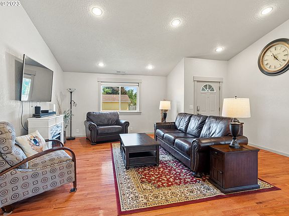 Very well maintained single level home in Thurston! Beautiful hardwood floors throughout living areas, primary bedroom w/ suite, walk-in closet & new ceiling fan, 2 other beds with carpets and double closets, 1 with new ceiling fan! NEW INTERIOR PAINT! Spacious entry and living room with vaulted ceilings, hardwood floors & recessed lighting. Kitchen with new appliances, island with an eat bar and gas plumbed behind range. Slider to covered back patio for entertaining and cooking. Hot Tub included with it's own gazebo! New Gas Hot Water Heater! Well maintained yards w/ newly gated RV parking for your toys!