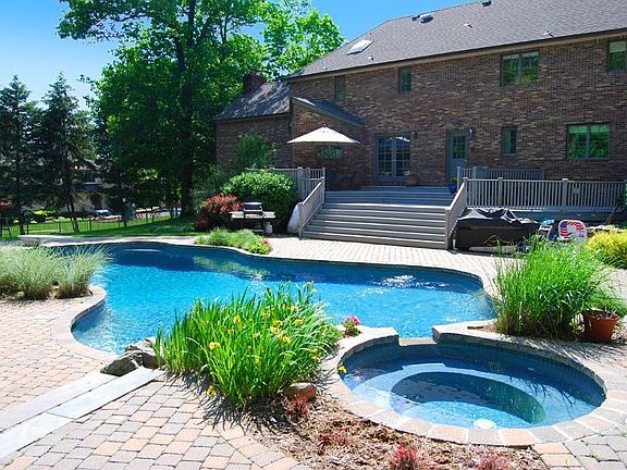 Light and Bright Stone Front Center Hall Colonial with 2 Story Entry Foyer. Oversized Dining Room with wood floors and large window. Formal Living Room with wood floors. Eat in Kitchen with Center Island and Dining Area with doors to the rear deck overlooking the pool and spa. Vaulted Ceiling Great Room with floor to ceiling brick fireplace. 5th Bedroom and full bath on the first floor. Spacious Master Suite with whirlpool bath and walk in closets. Finished Lower Level with Rec Room, Billiard Room, Gym, Storage and a cedar lined closet. Beautifully Landscaped private Rear Yard with Anthony® pool and spa. Located on a quiet cul de sac with circular drive and 3 car garage.