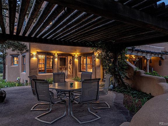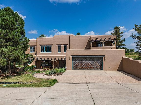 Awesome private 5 acre site heavily treed, close in and convenient to DTC, super Oak Hills neighborhood, authentic Pueblo style adobe home, 20" thick walls, Mexican tile some with coyote footprints, fir and pine doors, handmade bricks with two interior exposed brick walls, pine beams and hand carved wooden posts, pine ceilings with rough cut herringbone patterns, 2 fireplaces, kitchen with southwest style pine cabinets, pantry, Subzero refrigerator, Wolf gas range and oven, GREAT HOME FOR ENTERTAINMENT... COMFORTABLY ACCOMODATING UP TO 50 PEOPLE ON THE MAIN LEVEL, garden level (natural light) basement with office and desk included, wine cellar with seasoned wood, entry chandelier with crystal prisms casts a rainbow river from clearstory windows in winter, many custom Nichos (little notches cut in adobe) for display pieces, Master bedroom with 5 piece bath and Mexican tile, 200 sq ft walk in closet, guest bedroom with deck and bath with custom tile floor and claw foot tub, back patio with pergola and Taos pueblo style adobe oven, recently upgraded hot tub in lower secluded spot, tons of wildlife, hidden glade backs to Happy Canyon Creek. Lots of potential inclusions of furniture inside and out!