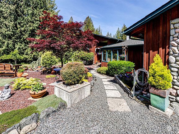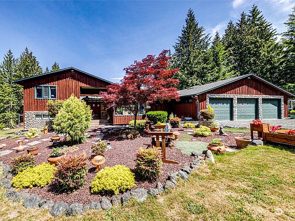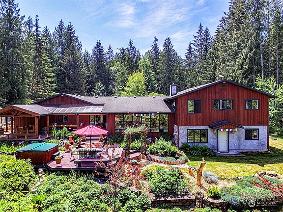 Ideal NW contemporary home tucked in the sought after Black Diamond area. All the house, garage & yard space you need! Multi levels allow for several spaces to enjoy-open concept living/kitchen/dining, primary suite w/triple closets, attached bath & laundry chute, extra bedrooms on the upper/lower levels, including addt'l living room w/wood burning stove. Lots of windows, beautiful tile, reclaimed oak, hickory & bamboo floors, solid kitchen cabinets w/custom pullouts & granite counters. Enclosed breezeway accesses the 3-car 1,260sf garage & slider to composite deck w/covered BBQ area, hot tub, and natural surroundings. Paver patio, firepit, recirculating pond, fruit trees, green house, fenced garden, sheds, shop & too many features to list!