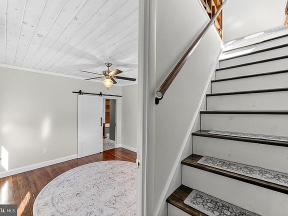 Newly renovated bathroomFarmhouse apron sinkInviting entry roomCharming barn doorsQuartz island with seatingConvenient laundry closetElm wood range hood