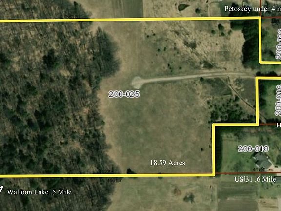 Appx 18.6 acres in a great location just south of Petoskey. Property features views of Walloon Lake and the countryside, and is close to US 131, and only 4 miles from downtown Petoskey. Solid existing driveway. It could be a great, estate sized parcel, or it has development potential; utilities at the road.