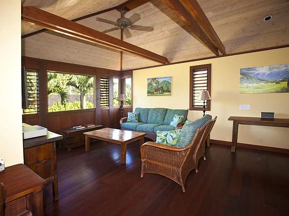 Relax like a local in this peaceful Hanalei Bay retreat, just steps from the beach. Featuring two air-conditioned king suites, vaulted ceilings, open living space, and a covered lanai, this home is perfect for surf-filled mornings and sunset dinners. Lounge on the punee, cook in the well-equipped kitchen, or stroll into town for shopping, dining, and music. Includes garage parking, indoor laundry, and tropical breezes all around. This charming home blends island comfort with laid-back luxury, just across the street from Hanalei Bay's world-famous beach. On the first level, two air-conditioned primary suites offer restful sleep and privacy. Upstairs, vaulted ceilings, hardwood floors, and abundant windows fill the open-concept kitchen, dining, and living area with natural light and island breezes. Step through sliding glass doors to the covered lanai for outdoor dining surrounded by lush greenery and fragrant flowers. The home also includes a cozy indoor punee perfect for reading, relaxing, or napping after a surf session. Includes garage parking for one vehicle. Steps to Hanalei Bay Beach, this home offers easy access to surfboard, kayak, and bike rentals nearby. A short drive will take you to Napali Coast, Princeville Golf and Spas, and helicopter tours. Outdoor markets, live Hawaiian music, yoga, and natural food stores are just minutes away. Located in a tsunami evacuation zone, clear instructions will be provided. Situated in a quiet residential area, be respectful of neighbors. Inquire before bringing additional guests beyond six.