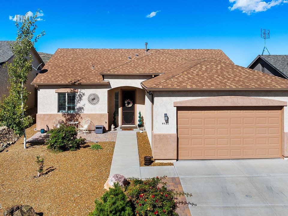 Welcome to a bright, comfortable, and immaculate 1,493 s.f. Granville home with views of iconic Glassford Hill! Greet visitors with a sunny, pavered seating area off the front entry and a custom security door. The popular, open concept floorplan with 3 bedrooms and 2 baths uses every inch of space to its advantage. An efficiently designed kitchen features stainless steel appliances (gas range included), classic granite countertops, plentiful cabinetry, corner pantry, and a stainless steel undermount sink. Enjoy casual seating at the peninsula or gather in the spacious adjacent dining area for family mealtimes. Your primary suite is a pleasantly sharable retreat, with dual sinks, large walk-in shower, roomy walk-in closet, and a commode closet for privacy. Upper cabinets in the laundry room mean handy storage. Two-tone paint, upgraded tile flooring, and stylish plantation shutters are nice touches found throughout. Entertain or unwind solo on your large, covered patio with a pavered extension - you'll enjoy breezes and blue skies in the fully fenced, easy-care backyard. Park larger vehicles easily in the 4-foot extended garage, where added cabinets help keep tools and more organized. Quality construction: post-tension foundation, 2x6 exterior framing, 10-foot ceilings and 8-foot doors. Take advantage of Granville's top-notch community amenities, included in a very reasonable HOA fee: multiple clubhouses with activities, pools, gyms, parks, trails, playgrounds, tennis & pickleball courts, a dog park, and more. Prescott Valley's shopping, entertainment venues, restaurants, and medical facilities are just minutes away...plus, you'll have easy highway access to both Pioneer Parkway and AZ-69. An ideal home for a primary residence, lock-and-go second-home, or investment property!