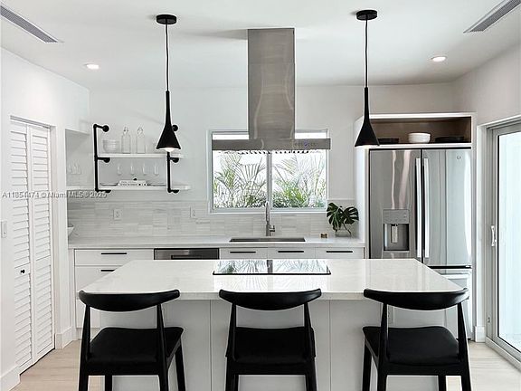 Settle into this charming, newly renovated 4-bed, 3-bath cottage-style pool home in desirable Little Gables. With 1,857 SF of open living, it blends coastal character with modern style and indoor-outdoor entertainment. Wide-plank floors run throughout, and wainscot shiplap adds warmth to the foyer and dining room. The designer kitchen features an eat-in island, quartz counters, high-end appliances, wine cooler, and walk-in pantry. Sunlit kitchen and dining areas open to a covered terrace with marble pavers and ample space to dine or lounge. Enjoy a sparkling pool surrounded by lush landscaping. Impact windows and metal roof (50+ year lifespan) provide energy efficiency and insurance savings. Ideally located minutes from Coral Gables and a short drive to Coconut Grove and Brickell.