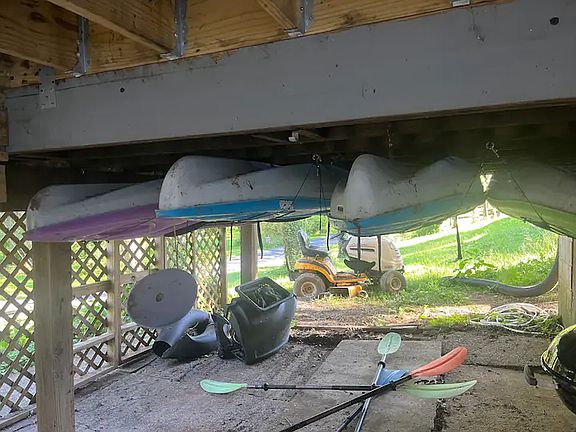Deck balcony, kayaks for use, ceiling fans, nice yard, and lots of parking.