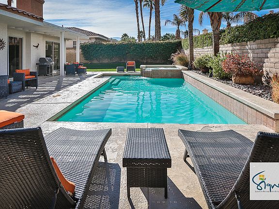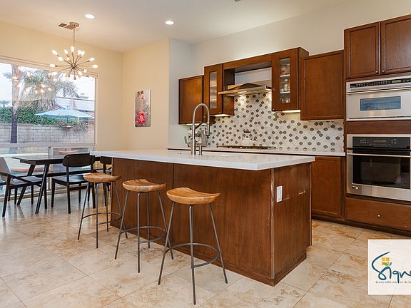This immaculate home offers 3 Bedrooms plus office/ den, 2 Baths with a great split floor plan for extra privacy. Remodeled kitchen with stainless steel appliances, convection microwave, convection oven, wine cooler, ceasarstone nugget counter tops, travertine flooring, new riverwood oak stone flooring in the bedrooms, newer paint inside and out. This beautiful property is centrally located in Palm Desert close to schools, El Paseo, shopping and restaurants and shows an incredible pride of home ownership! A private backyard with manicured landscaping, outdoor lighting, salt water pool with elevated spa and mountain views completes this gorgeous home. Furnishings negotiable.