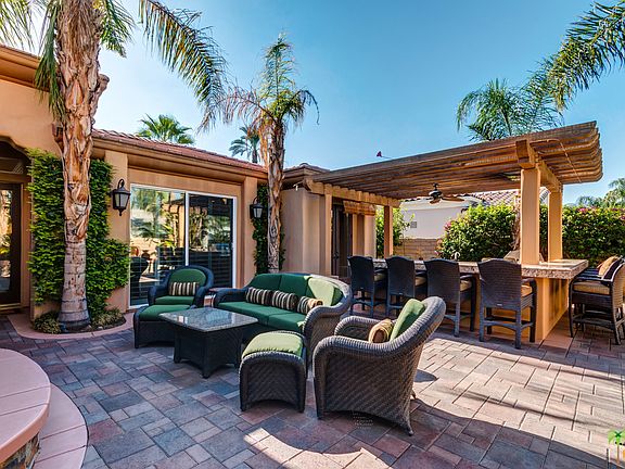 Elegance beyond words. This incredible home with four bedrooms, one used as an office, and three baths is near shopping, dining and entertainment. The courtyard offers a relaxing atmosphere with an outdoor fireplace with seating for six plus a large BBQ/bar area with nine high top chairs - great for entertaining. The back patio includes the salt water, pebble tech pool and plenty of seating for family and guests. The family/kitchen leads to the front courtyard. The living/dining area opens onto the back patio. The spacious master bedroom is at one end of the home. The master bath has double vanities and a large walk-in closet. The two guest bedrooms are at the opposite end of the home offering extra privacy for family and guests. Crown molding, wide baseboards and granite kitchen counters make this an incredible home. Living in Indian Wells has wonderful perks for dining and golfing for residents. Unfurnished but furnishings available outside escrow.