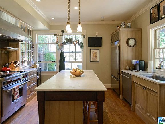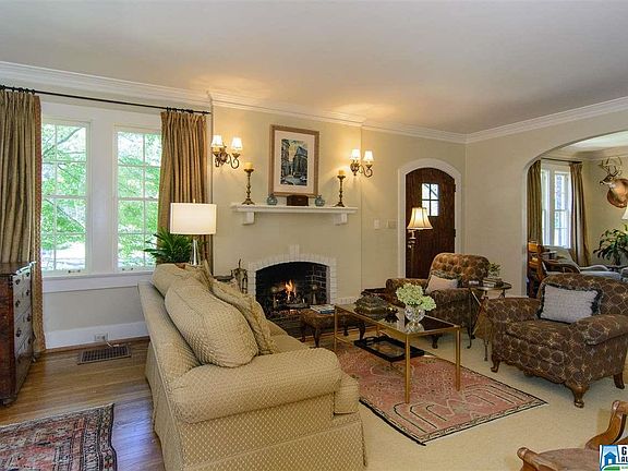 Built in 1928, this upscale Tudor located in historic Forest Park, has been modernized and elegantly renovated. Special feature: Crystal Chandelier from the original Tutwiler Hotel (C.1914); Antique Roman Valance from Paris Flea Market in Kit, Alabama White Marble countertops in the kitchen & bar; spectacular landscaping ; Artistic Elements by local Metal Artist: bronze front door awning & handrail, bronze cabinet on patio (wired for TV). The gourmet kitchen includes: Wolf stove, Asko DW, subzero & custom cabinets w Restoration Glass. All original: floors, front door, 2 bedroom brass ceiling lights, stone retaining walls & patio. All mortar repointed. Exterior recently painted. Lifetime slate style roof. Rear 2 car detached garage plus a front parking pad for 3 cars. Sprinklers/Security System/Exterior lighting/fenced backyard. Electrical/plumbing updates in 2007.Walking distance to Triangle Park, shopping & great restaurants. Convenient to UAB & downtown.