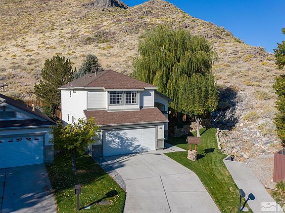 Great curb appeal and location in the Villages, a small enclave of homes in SE Reno, Donner Springs area. This home has a great open floor plan and charming private yard with covered deck and mature trees. Borders open space. Living area- high ceilings, gas fireplace. Island kitchen, breakfast nook, pantry and backyard access. Primary bedroom has large walk in closet. New interior paint and window coverings. New dishwasher. Really a charming home in a great area close to all conveniences! Easy to see.