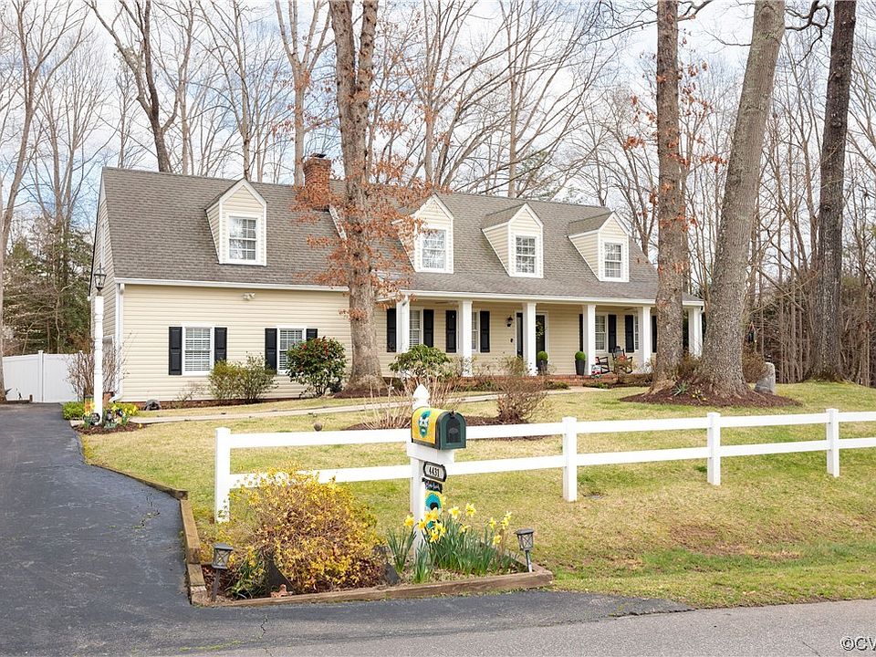 This beautiful property is ready to AMAZE you! Immaculate inside and out, this 2-story/cape is move-in ready. Quietly situated at the end of a street with no thru traffic, the front has an attractive white ranch rail fence and there is a large covered porch to sit for quiet time or welcome your guests. As you step into the foyer with hardwood floors, there is a closet and access to the living room and kitchen. The beautiful living room has hardwood floors, a whitewashed brick fireplace with gas logs and wood bin. French doors lead to an outstanding sunroom. The sunroom has laminate flooring, ceiling fan and skylights. There are 10 windows that overlook the backyard and sliding glass doors for access to the multi-level deck and large patio. The yard is an oasis with vinyl privacy fencing, just waiting for your family or for entertaining. Back inside, the kitchen has hardwood floors, antiqued cabinets, granite counters, tile backsplash, indirect lighting and appliances convey. There is also a large eat-in area with a bay window. Powder room is located off the kitchen and there is a laundry room with ceramic floor, cabinets, window and access to the garage. The primary suite located on the main level has hardwood floors, ceiling fan, walk-in closet, plus a double closet. The primary bath is ceramic tile with double vanity, jetted tub and solid surface shower. Hardwood steps with carpet runner take you to the expansive second level with hardwood hallway and 3 bedrooms with carpet, ceiling fans, walk-in or double closets. Bedrooms 2 & 3 are connected and can be a bedroom and sitting room or they are large enough for a rec room. There is an office located on the second level with carpet and a dormer window. The hall bath has ceramic floor, large single vanity and ceramic tub/shower. The side entry 2-car garage is large with pedestrian door, sink and shelving. The features and beauty are endless with this home. Do not miss your chance to see it!