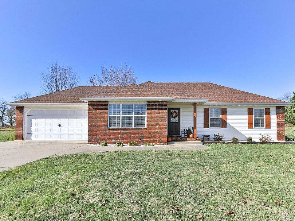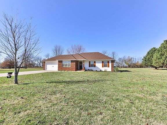 Country living at its finest in Turtle Creek west of Bolivar! Darling, efficient 1388 square foot three-bedroom, two-bath meticulously kept house on 1.67 acres with a large back patio and a storage building. From the picturesque covered front porch, you step into the foyer with coat storage and into the living room with a tall coffered ceiling. In the living room, you'll see the sliding door on the west side opens to the large patio and huge yard in the back. The large kitchen to the left has a breakfast bar, eat-in area, and updated stainless steel refrigerator, double-oven freestanding stove, dishwasher, and microwave that all stay with the house! The north wing of the house to the right of the foyer leads to the home's three bedrooms. Two ancillary bedrooms share a hall bath while the master bedroom has an ensuite bath and a walk-in closet. The self-contained laundry room is conveniently located in the bedroom hall along with additional storage. New luxury vinyl tile thoughout the living room, kitchen, hall and bathrooms. The home shares a well with the neighbor to the north and has a private septic system. In the backyard, you'll find a storage building, a fire pit, and a large patio.