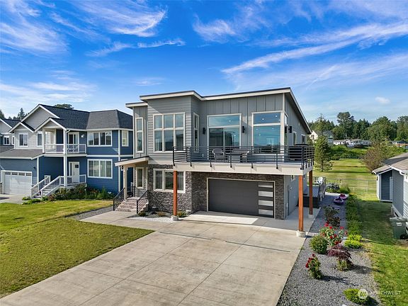 Welcome to your dream coastal retreat in Sandy Point Arm community! This home offers modern luxury + premium finishes, breathtaking views of the bay, San Juan Islands, Mt Baker, River & the Golf Course. Includes separate living suite studio unit w/ kitchen + bathroom (income of $3K per month!). The bright open-concept kitchen + living + dining rm is an entertainer's dream, w/ walk-out deck. Large floor-to-ceiling windows, vaulted ceilings, cozy fireplace, large island, tile throughout, huge primary suite. Backing up to golf course, easy access to community beach across the road for kayaking, paddle boarding, etc. Move-in ready or perfect for vacay home or VRBO/Airbnb. Community features: pool, clubhouse, marina, boat launch, golf course +.