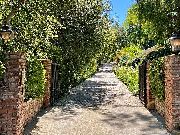 This very private walled and gated estate of more than one and a half acres south of Ventura Boulevard is an entertainer’s paradise that showcases a classic English Tudor home which was featured in the 1990’s CBS Television Christmas Classics special hosted by Marie Osmond. Downstairs off the main entry hall there is a large formal living room with used brick fireplace and high ceiling, an expansive den with high ceiling and another used brick fireplace and custom built oak A/V cabinets and wet bar with wine storage refrigerators, and a formal wood paneled office with its own fireplace and leaded glass bay window overlooking the grounds. There is also a large chef’s kitchen with Subzero refrigerator and freezer and built in Gaggenau appliances and a sunny breakfast room with bay windows overlooking the backyard. A formal dining room with French doors leads to the back patio and pool yard, and a maids room with en suite full bath, laundry room, guest bathroom and four car garage complete the ground floor. Two oak staircases lead to the second floor featuring five bedrooms with en suite bathrooms including a large high ceiling master suite with its own private sundeck. The third-floor includes a large family room with built-in wet bar, game table, A/V, cabinets, game closet, and French windows overlooking the front, back and side yards, as well as its own powder room leading to an attic with substantial storage areas. More than 1.5 acres of landscaped grounds include more than a dozen mature oak trees, a north-south Championship lighted tennis court completely surrounded by 12 foot tall green hedges, a large heated pool with deck Jet fountains and a built-in spa that can accommodate more than a dozen people. A covered patio accessible through large French doors off the formal den showcases a used brick outdoor fireplace, and a fire pit area that seats a dozen all flowing on to more than 5,000 square feet of lawns and gardens with mature roses and azaleas surrounding the pool and spa. The backyard is above all adjacent properties and completely secluded and private.