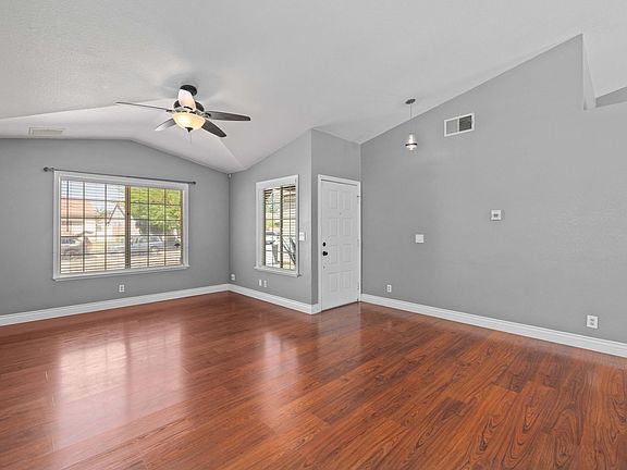 Welcome to this beautiful single-story home offering 3 bedrooms and 2 bathrooms, sitting on a nicely landscaped 6,825 sqft lot. As you pull up, you will notice the clean and low-maintenance desert landscaping that gives the front yard great curb appeal! As you step into the backyard, you will find two covered patios, a large lawn perfect for kids & pets, and a built-in sandbox. Inside, the home is open and inviting with vaulted ceilings and an abundance of natural light. You will find upgraded laminate flooring and modern recessed lighting that flows throughout the main living areas. The kitchen opens up to the family room making it perfect for entertaining. It features granite countertops, tile backsplash, stainless steel appliances, and plenty of room to cook and gather. The family room has a fireplace, perfect for those cold winter months. All the bedrooms are spacious with nice carpet and ceiling fans. The garage has been upgraded with custom cabinetry, giving you tons of extra storage and workspace. You're just minutes from schools, parks, and restaurants. Schedule a showing today as this home wont last long!