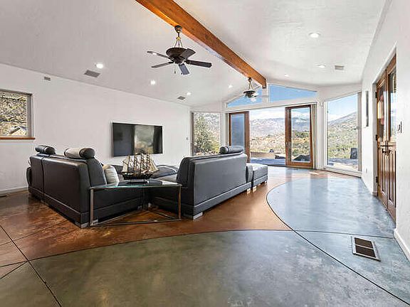 How does one describe such uniqueness and beauty? This mini-ranch with designated fenced areas for animals, sits on 4+ acres. The breathtaking views up canyon to Sequoia Park and morning sun are welcoming. Set up for relaxation, the low maintenance yard with massive boulders, rock walls and swimming pool is an entertainers dream. Energy efficient features of the home include Blue Max concrete walls, stucco, steel clad exterior doors, metal roof and solar. Upon entering the home, the high ceilings and walls of windows draw one in. The kitchen is open to the living room and office space. The spacious master suite has a large walk-in shower, tub and dressing area. The stained concrete floors throughout continue down the sculptured hall to the vestibule nook and additional bedrooms and bathroom. At the far end of the home is an amazing recreation/flex room. EV charger, multiple dedicated workspaces, and optional workshop area are some of the many extras to explore. This custom home in a private setting is a must see!