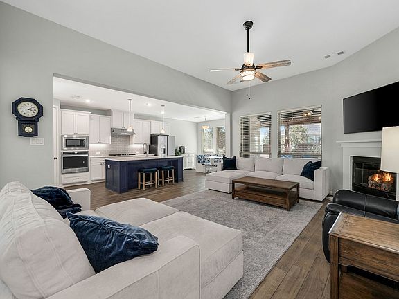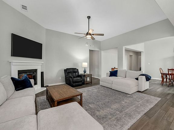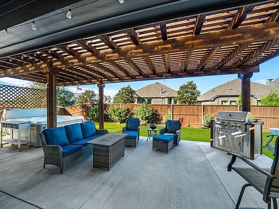 Situated on a corner lot in Lilyana, this thoughtfully designed one-story offers clean lines, functional spaces, and inviting indoor-outdoor living. A front-facing, three-car tandem garage and simple landscaping set the tone, while the interior showcases wood-look tile throughout the main areas for a cohesive, low-maintenance feel. The open living area features a gas fireplace with concrete surround and glass front, flowing seamlessly into the dining space and kitchen, ideal for everyday living and entertaining. The kitchen impresses with quartz countertops, a large island with breakfast bar, sink, and dishwasher, gas cooktop, built-in oven and microwave, and walk-in pantry. A cozy nook adds flexibility for casual dining or morning coffee. A front bedroom with solid French doors, ceiling fan, and a shelving closet offers versatility as a guest suite or study. Two secondary bedrooms each include walk-in closets and ceiling fans, sharing a well-appointed bath with cultured marble vanity and tub. A stylish powder bath with decorative tile adds convenience for guests. The spacious primary suite is a true retreat with vaulted ceilings, bay windows, and an ensuite bath featuring separate quartz vanities, an oversized walk-in shower, linen storage, and a large walk-in closet with shelving. The utility room is equally impressive with wood-look tile, a large stainless sink, tile backsplash, upper cabinets, and space for an extra refrigerator. Out back, enjoy a covered pergola and generous patio, perfect for relaxing or entertaining year-round. Lilyana offers resort-style living with multiple pools and amenity centers, parks, playgrounds, sports courts, a dog park, catch-and-release pond, miles of walking and biking trails, and access to highly regarded Prosper ISD schools, including an on-site elementary, all just minutes from shopping, dining, and everyday conveniences.