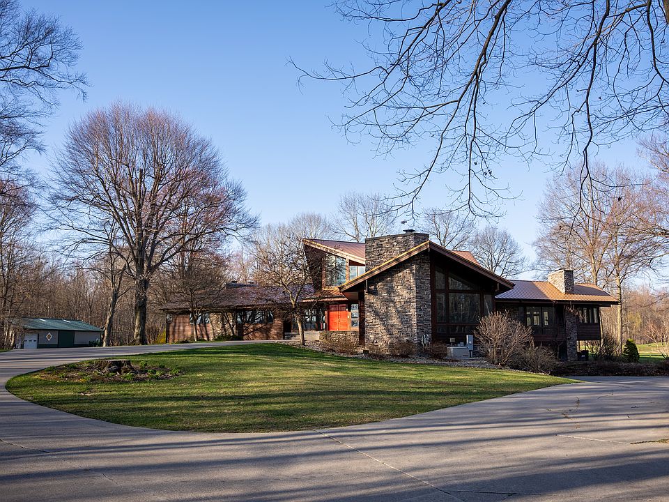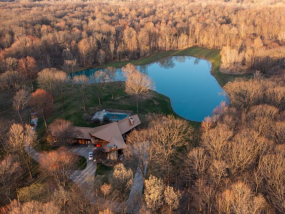 NEW CURRENT TRAIL CAMERA PICTURES AND VIDEOS OF SOME VERY LARGE BUCKS AVAILABLE TO ANYONE AT THE TIME OF SHOWING….CALL ME TODAY TO DISCUSS..!!Looking for the best of all worlds? This is it! This 9000 sq ft home was designed by the renowned architect Tim Evans and shows many of Frank Lloyd Wright's influences. From the angle of placement on the property to enjoy the sunrises and sunsets to the angled stairways, it is custom-designed in every way. Built in 1998, it fits on this property like a glove. As you can see from the images, it is somewhat in the shape of the Mercedes symbol, and the amount of large panoramic window configurations allows a spectacular view from everywhere in the home. From the kitchen equipped with Viking appliances, you can see at least 180 degrees on the property, making it awesome for entertainment. Large four-foot overhangs built into the roofline provide protection from the sunlight allowing it to remain cool in the home even on the sunniest of days, yet they do not impede the views. The top floor is currently a large office surrounded by glass and is an awesome man cave. The first-floor Main bedroom is very private from the rest of the house and features a large fireplace and ensuite bathroom as well as an attached hot tub room with a fireplace and a large sauna. The home has a total of 5 bedrooms, with four being on the ground level, all with tremendous views. The large glass windows in the back side of the home look directly at the beautiful inground pool as well as the 3-acre pond that is stocked full of bass, bluegill, catfish and perch. All of the wildlife, and there is a lot, use this pond practically daily, so watching them is non-stop. The deer population is very high, and I have seen upwards of 40-50 deer every time I have been there. I watched over 40 deer leave the tilled corn field the morning we photographed the property and 15-20 turkey. They all, for the most part, bed in the timber behind the house and behind the beautiful pole barn that is there for all the toys or horses if you like. There are also 105+/- acres of tillable crop ground that is cash rented for income annually. This property is truly the best of all worlds to anyone who appreciates privacy, nature and wildlife as well as world-class luxury. I could go on and on, but honestly, it truly needs to be seen to appreciate the quality. Simply call me today for a private tour.
