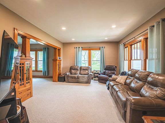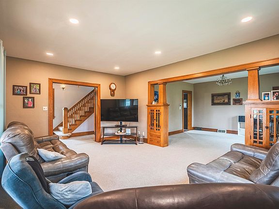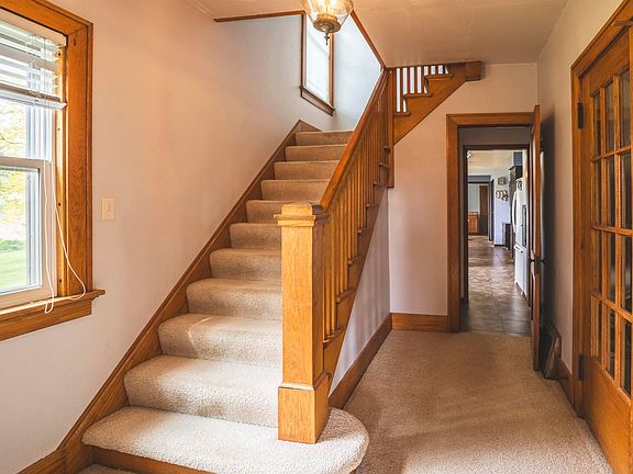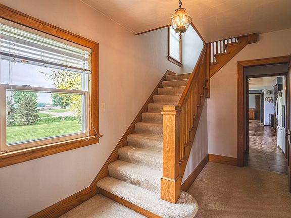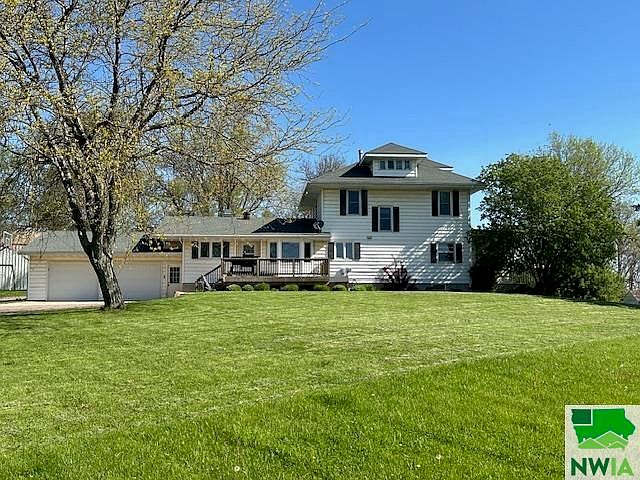 This quality 2 story home located 1/4 mile from the town of Hospers, Iowa has so much to offer for anyone looking for an acreage with a great location. The size of the home consists approximately of 1600 sq ft, 3/4 bedrooms, a bathroom on each level, a very nice workable kitchen with all appliances staying, large laundry room with washer & dryer. The potential fourth bedroom on the main floor is presently used as an office. Combination parlor and living room separated by oak colonades is carpeted but nice oak hardwood flooring is underneath. French doors lead you to the open staircase to the 2nd floor and the 3rd floor is a walk-up attic for extra storage. The 2nd floor bedrooms are carpeted but there is oak hardwood flooring beneath. This home was moved onto this location and added onto so the basement is a Liteform foundation consisting of a large family room, 3/4 bath and large storage room and/or a 2nd kitchen along with a 2nd set of stairs coming from the garage. The heating and cooling system is supplied by an electric heat pump installed in 2022, rural water, new septic system installed 10 years alo, vinyl siding, many of the windows have been replaced and a large deck to the front of the home. One of the more important structures with this acreage is the 60' x 108' machine shed which is completely cemented. By viewing this property, you will understand how great the location is with the view it has, the quality of the structure and endless potential and possibilities.