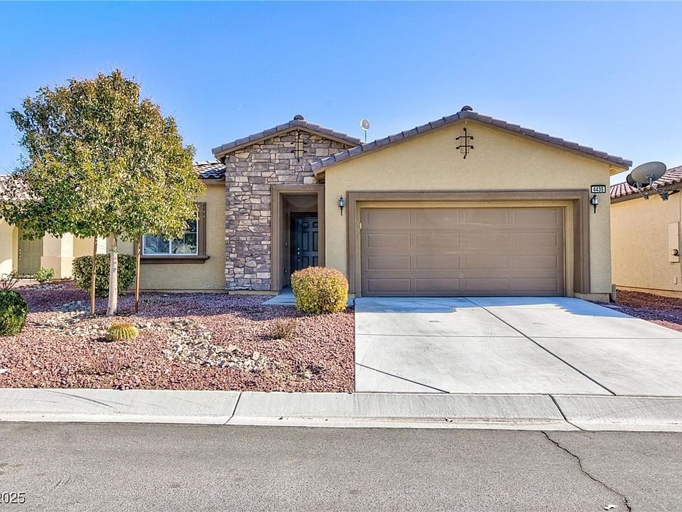 Charming desert oasis in Mountain Falls golf-course community! This 2-bedroom home with a spacious den/office (convertible to a 3rd bedroom) offers 1,533 square feet of smartly designed living space. The primary bedroom is set apart for added privacy, complemented by 2 full bathrooms. An inviting foyer leads to an open floor plan with great room, dining area, and kitchen combined - featuring stainless steel appliances and a large island; also a separate laundry room and 2-car garage. Tile floors run throughout the common areas, with cozy carpet in the bedrooms. The covered patios overlook a spacious, desert-landscaped backyard - ideal for adding a small pool or spa. Located next to a neighborhood park and nestled in Mountain Falls - enjoy walking paths, a clubhouse with fitness rooms, social events, resort-style pools, jacuzzis, and on-site restaurant—all for a low monthly HOA of $110. This home blends comfort, convenience, and resort-style living! Make it yours today. Won't last long!