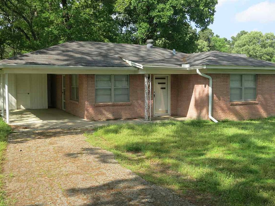 1002 sf, 2/1/1 brick country home on 5.5 acres, only 2.5 miles from Loop 281 in Longview. Hallsville ISD. Tidy house, park-like trees and native woods. The owner would consider subdividing the tract, selling 5.001 acres without the house. [Square footage and age of home figures come from county Appraisal District information; buyer is encouraged to confirm square footage for themselves]. 1002 sf, built 1960; 2 bedroom, 1 bath, 1-car carport, on concrete slab. Brick veneer, vinyl soffit and fascia; composition shingles, partial rain gutters. Aluminum storm windows and glass storm doors. Kitchen has nice wood cabinets, electric stove/oven, dishwasher, double stainless steel sink, laminate countertops, breakfast bar. Bath has fiberglass tub/shower with glass doors; single sink; molded countertops. Sculpted carpet in living room and bedrooms; sheet vinyl in kitchen, dining, hall, bath. Painted paneling in living room, kitchen, dining and bath; sheetrock in bedrooms. Ceiling fans, smoke alarms, plastic mini-blinds, reach-in bedroom closets. Electric central air and heat; programmable thermostat. House appears to be well-maintained; good paint, flooring and roofing. 6x8 ft utility/storage room under carport; hookups for washer and electric clothes dryer. Old shallow well near house, disconnected, condition unknown. Asphalt driveway from street to house. Very large trees provide a scenic lot and great views from the house. Approximately 242 feet of frontage on Smelley Rd.