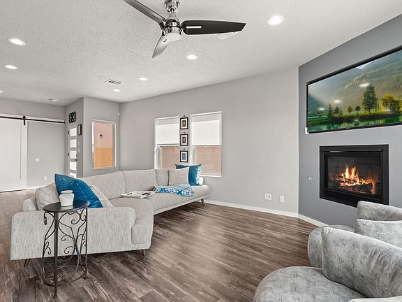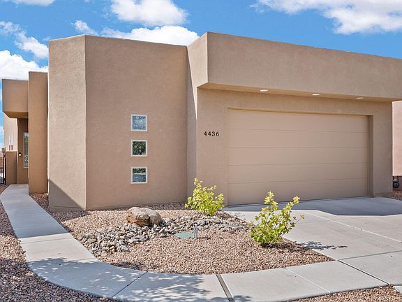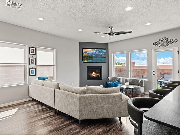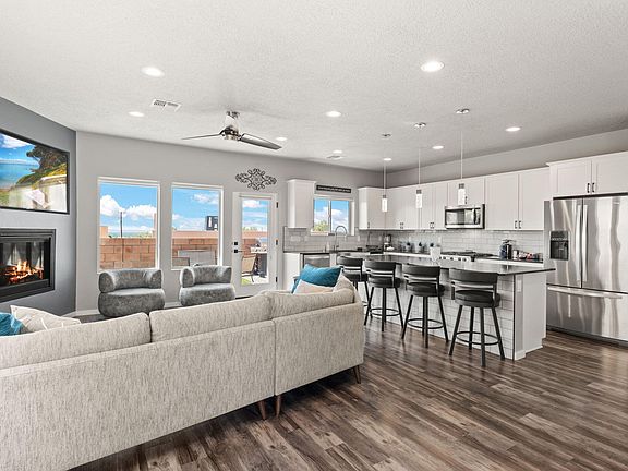 Welcome to this stunning Desert Sage custom-built single-story home in the gated Sara's Meadow community of Rio Rancho. This beautiful residence offers 1,380 sq. ft. with 2 bedrooms, 2 bathrooms, and a 2-car garage. Enjoy laminate wood floors and a modern kitchen with white cabinetry, granite countertops, subway tile backsplash, stainless steel appliances, a large island, and a pantry with a barn door. The open living area has a gas fireplace with a TV inlay (TV included). The owner's suite features outdoor access, dual sinks, an oversized vanity, and a custom walk-in shower. The low-maintenance, fully walled yard is perfect for relaxation. Quiet neighborhood close to trails, shopping, and dining.