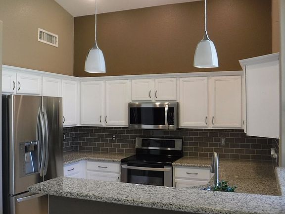Special house - not your average rental! Grass yard in back with covered and uncovered patios, lush landscaping. Patio doors to backyard from both the master BR and kitchen areas. Three bedrooms plus an office/den area off the living room. High ceilings, great new and upgraded stainless appliances, indoor utility room with washer and dryer. Travertine floors in the main house, carpet in the bedrooms. Master bedroom has walkin closet, master bath has nice roll-in shower. Kitchen has a pantry, granite counters, breakfast bar - come explore this house and see if it is your new home.