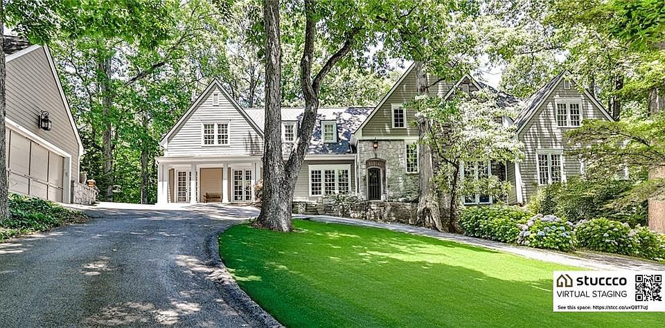 NEW LISTING! Amazing value!! Priced well below appraisal. Vinings stone and siding home is beautifully situated on one and a half private, wooded acres with custom pool, three car garage, fenced yard, and lots of lovely, shaded, outdoor space. Custom built in 2005, the extremely well-maintained house comes complete with many upgrades including a whole house generator, elevator, new roof, and multiple maintenance warranties. The interior has a traditional floorplan with beautiful crown molding with 12-foot ceilings and hard wood floors thru-out. The main floor comes complete with a library with floor to ceiling custom, built-in bookshelves, a traditional dining room, entrance hall, and large living room with fireplace. The breakfast room overlooks the pool and family room with multiple French doors and windows allowing lots of natural light. The master on the main has a well-appointed bathroom complete with marble soaking tub and huge master closet and a separate sunroom that opens onto the pool. The second floor has three bedrooms with ensuite bathrooms as well as an additional “playroom” or bonus room that could be easily converted to two more bedrooms. The finished daylight basement has another bathroom and is currently being used for storage but could easily accommodate a media room, wine cellar, and exercise room. This lovely home is located in the heart of Vinings, on the best part of Woodland Brook between Orchard Grove and Polo Lane. House is now vacant and some pictures are virtually staged, others are orignal photos, indicated below the picture.
