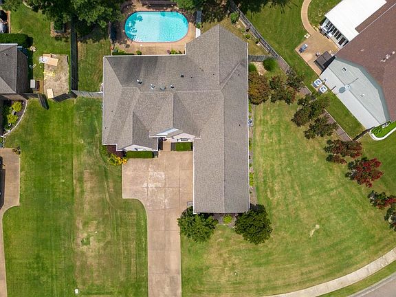 The perfect back yard for Summer - hang out by the gunite, mineral water pool. Covered back patio for cooking out & entertaining. Split bedroom floor plan w/3 bedrooms down + office, formal dining room, sunroom & breakfast room. Kitchen has been updated to include a 6 burner gas Viking range & vent-a-hood, pot filler & new SS dishwasher. Spacious primary BR. Walk in pantry. Upstairs is add'l bedroom + bath. 3 car garage-3rd bay heated & cooled. Huge expandable area. Water tanks-2020 & 2023.