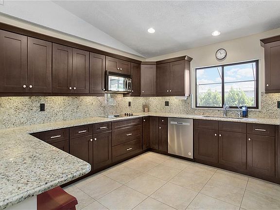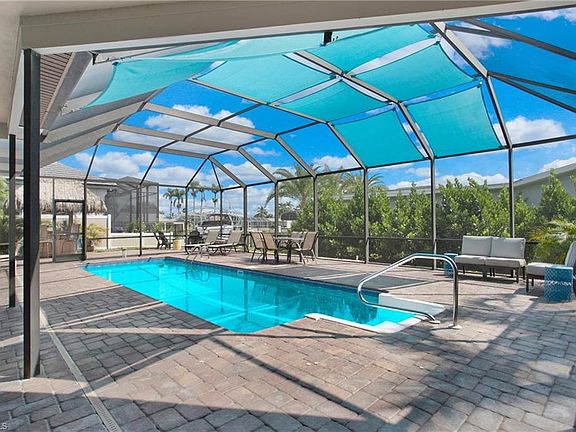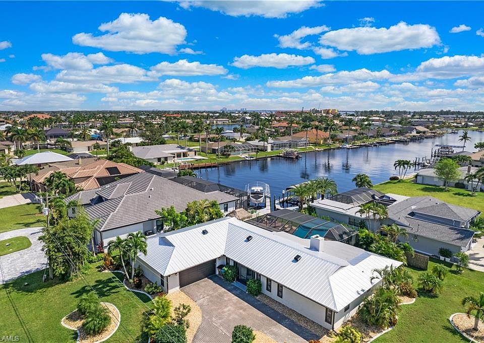 MOTIVATED SELLER, ALREADY BOUGHT ANOTHER HOME. Enjoy captivating water views from this pool home in a fantastic Cape Coral location without the hefty waterfront price! This well-maintained 3 bedroom, 2 bathroom home is on an oversized corner lot in the desirable Orchid neighborhood. Featuring all tile flooring throughout, plantation shutters, a new (2023) metal roof with new front gutters, vaulted ceilings, multiple sliders providing lanai access and filling the home with natural light, a garage with mini-split A/C accommodating 4 vehicles (2 deep), 3 solar attic fans, the list goes on! Inside, you'll love the open floorplan, featuring a large kitchen with ample cabinetry, granite counters, and stainless appliances. The main suite offers lanai access, a spacious walk-in closet, and a spa-like en suite with dual sinks, a soaking tub and separate shower. Enjoy the convenience of having a laundry room with full size units, plus stackable units in the 2nd bathroom. Step outside into the outdoor oasis, with a caged pool and outdoor dining/living area, plus an open air paver patio complete with a tiki bar! With it's location close to downtown Cape Coral, a multitude of shopping, dining and entertainment options plus both bridges are just minutes away.