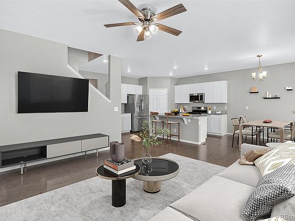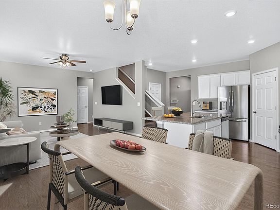 Built in 2019, this thoughtfully designed 5-bedroom home offers a versatile floor plan that adapts to every stage of life. The main level features a bedroom with access to a full bath, ideal for guests, multi-generational living, or anyone seeking single-level convenience. A dedicated home office provides the perfect work-from-home setup, while the open-concept kitchen, dining, and living areas create a connected space for everyday living and entertaining. Upstairs, you’ll find 4 spacious bedrooms, a loft, and a convenient laundry room—washer and dryer included. The primary suite is a true retreat, with a sitting area perfect for reading, relaxing, or watching TV and a spacious walk-in closet. The kitchen shines with white cabinetry, granite counters, and a center island, while owned solar panels provide energy savings. Recent maintenance includes professional cleaning of the gutters and air ducts, offering peace of mind for the next homeowner. The unfinished basement with a rough-in bath offers endless potential for future expansion—whether you envision a media room, gym, or guest suite. Step outside to an impressive backyard offering endless possibilities for outdoor living and entertaining. Enjoy the covered patio and an extended stamped concrete patio to accommodate gatherings large and small—and a playset ready for hours of fun. The covered front porch is the perfect spot to unwind. Some photos have been virtually staged. Located in the Copperleaf community, this home offers easy access to E-470, Southlands Shopping Center, the Aurora Reservoir and DIA. Residents enjoy community parks, trails, the Arboretum Clubhouse, sports court, and outdoor pools. The neighborhood’s Activities Committee hosts year-round events—food trucks, movie nights, and holiday celebrations—that make it easy to connect with neighbors. Plus, the home is within the Cherry Creek School District. This home combines comfort, flexibility, and a fantastic location—don’t miss this opportunity!