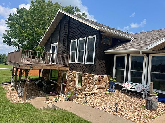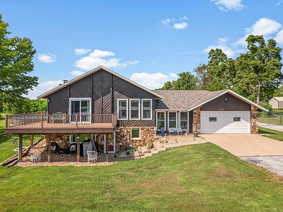 4439 E State Highway 14, Sparta MO 65753. Front facing walk-out basement home in OZARK SCHOOLS. Wood and stone front with BRAND NEW shingles/gutters, landscaping and Pella windows gives great curb appeal! Beautiful stone, wood-burning fireplace in living room. One bedroom on basement level and large, tiled walk-in shower in the bathroom. Luxury vinyl plank and tile flooring. Attractive, sturdy wood staircase and railing leads to big laundry room and spacious master bedroom with 2 walk-in closets, master bathroom and adjoining bonus room beyond the multi-paned door. Step out onto the wrap-around composite deck with metal railing. Access from the master bedroom and the other upstairs bedroom. Large sunroom adjoins house and deep garage. Smart thermostat. Keyless entry on both exit doors. Outdoor amenities include smart garage door opener, 36'x24' shop with wood stove and additional 12' lean-to, insulated well house, fruit trees and blackberry bush and above ground 24 foot pool for cooling off in the hot summer weather! Close to schools and shopping.