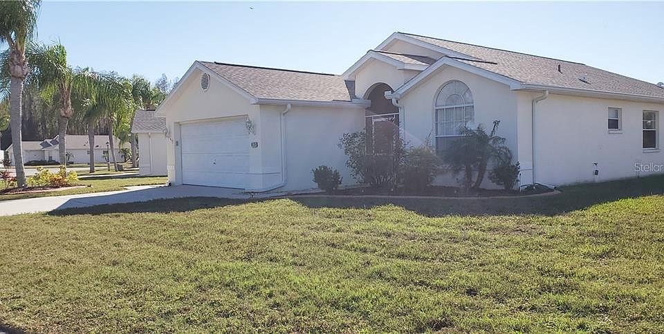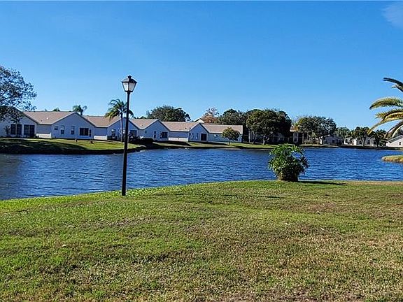 Don't miss out on this wonderful 2-bedroom, 2-bath lakefront home in Millpond Lakes, a lovely gated, well-kept community that is NOT age-restricted. You'll love the serene lake view from the living room, master bedroom, and vinyl-enclosed lanai. The home sits on a third acre which is conveniently located near great shopping and restaurants, a large medical community and a hospital. The split-plan home of 1590 square foot has a home office or den with a French-door entrance, which can, when necessary, serve as a guest bedroom. The large eat-in kitchen features a work island with pull-out drawer, a closet pantry with four pull-out drawers, and a laundry closet complete with a washer and dryer. The cathedral ceilings that are in every room making each one appear even more spacious than they already are. You'll find carpet in the living-dining room, tile in the kitchen, baths, foyer, and hallway, and laminate in den and bedrooms. The floorplan was designed to make entertaining easy. The kitchen, living and dining room combo together with the lanai whose 9-foot slider fully opens making a very spacious area where folks can easily move from the food and drinks to the patio and big backyard with that lovely lake view. New roof and gutters were installed in 2019. The pool is just a short walk away, and you'll have access to Millpond Lakes' larger, heated pool and hot tub at the gorgeous clubhouse. No need to keep that gym membership when you can workout at the newly equipped fitness center in the active clubhouse. It's an easy commute to Clearwater and Tampa since the Suncoast Parkway is about 15 minutes away. Busch Gardens and the world renowned Clearwater Beach are approximately 45 minutes to an hour away. This is the Florida you've been dreaming about. Put that snow shovel down, and trade it for your place in the sun. The home may be purchased furnished.