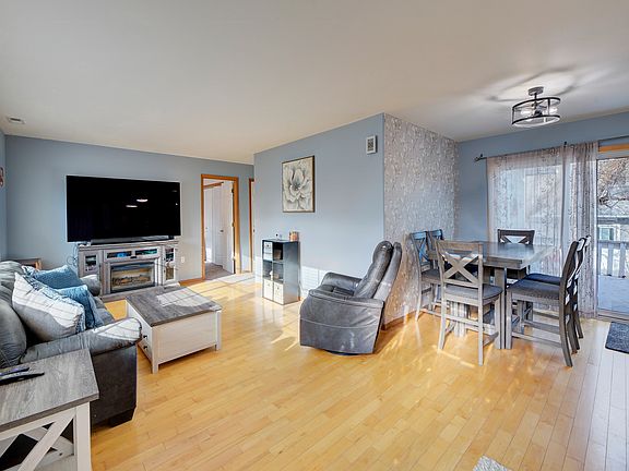 The main floor is bright and welcoming with hardwood floors reflecting the sunlight through the large windows. Newer appliances and light fixtures add a fresh touch.