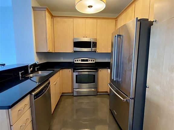 Downtown living at its best. Walk to everything! Freshely painted with newly finished polished concrete floors throughout the main floor, new refrigerator and washer dryer too. Main level has powder room, kitchen with granite counters and stainless appliances, dining area and large living room with sliding doors to small balcony. Upstairs are two en-suite bedrooms, walk in in MBR has closet system 2nd BR has two closets for plenty of storage. Two covered parking spaces, secured building.