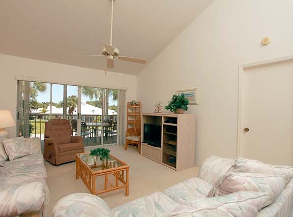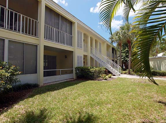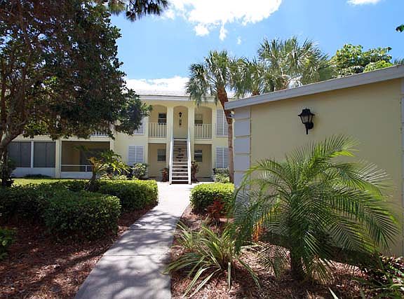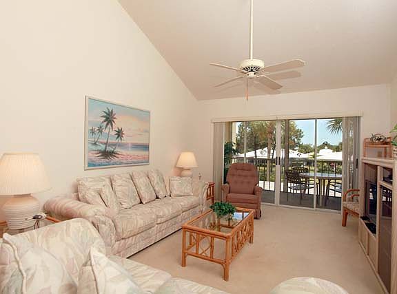 Seasonal: 2 bedroom, 2 bath upstairs unit. Screened balconies off both bedrooms, Cathedral ceilings in living and dining rooms. Enjoy peaceful Florida living on the big, screened lanai overlooking lagoon and swaying palm trees, or cool off in the community pool just steps away. Sorry, no pets allowed. Unlimited golf and all club amenities with transfer fee.