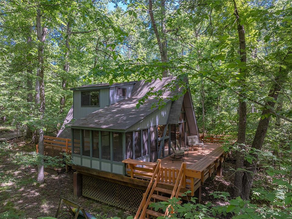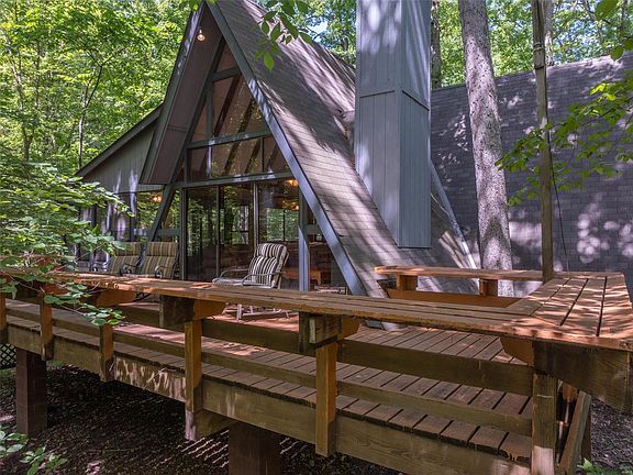Nestled on the shores of Foxfire Lake and strategically positioned near the main entrance, golf course, clubhouse, horse stables, and pool. Convenience harmonizes with natural beauty in this chalets idyllic setting. Tucked away, this hidden gem boasts unparalleled privacy and a private lakeside dock, inviting you to indulge in moments of reflection. Inside, the vaulted ceiling adorned with exposed beams and stone fireplace exudes rustic charm. Floor-to-ceiling windows frame captivating views of the surrounding wildlife. Savor quiet moments on the screened porch. With a main floor master bedroom, a cozy sleeping loft, and a second upstairs bedroom, there's ample space for everyone to unwind and recharge. Fully furnished this retreat is ready for fun. Follow the enchanting pathway through the woods to the dock, where adventures await. Fish, swim, or simply bask in the beauty of a sunrise. This property can be rented and is being sold As Is with the seller making no repairs.