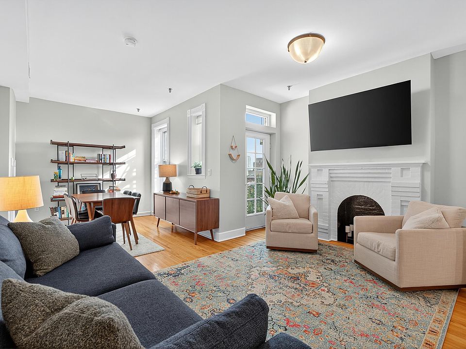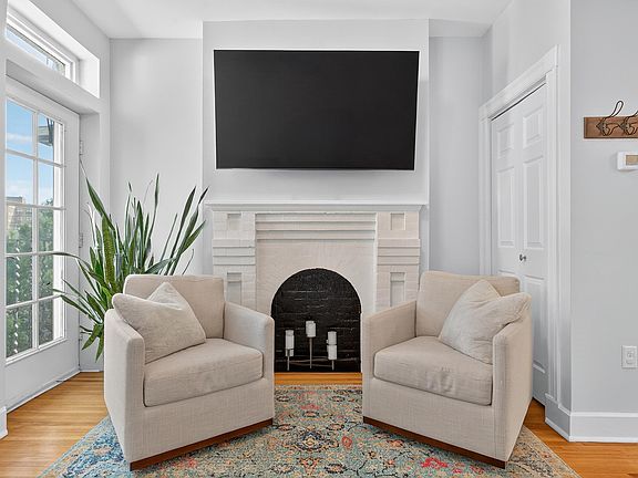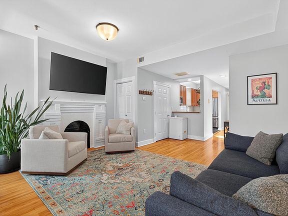 The main living space is bathed in light from the south-east facing windows. The elegant living area features an original decorative fireplace and thoughtful built-in shelving, flowing into a separate dining area. This move-in ready condo ensures modern comfort with Central AC & heating.