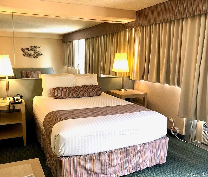 FEE SIMPLE HOTEL CONDO UNIT WITH LANAI . Aloha Surf Waikiki a boutique condotel nestled in the heart of Waikiki. Fully furnished studio with lanai offers air conditioning and kitchenette. Reasonable monthly fee include; Full hotel amenities with pool, outdoor fitness room, front desk, and concierge. Monthly maintenance fee includes all utilities: cable television, electricity, internet, water, hot water, phone, sewer. The large, open air lobby connects to a fitness area and Internet cafe& relaxing pool area with cabanas and barbeque grill . You will rest in a comfortable bed after a day full of walking and swimming in a quiet side of the building. Aqua Aston Hotels & Condo manages this unit. Aloha Surf zoning will allow you to do both short term or long term rent ( verify ).