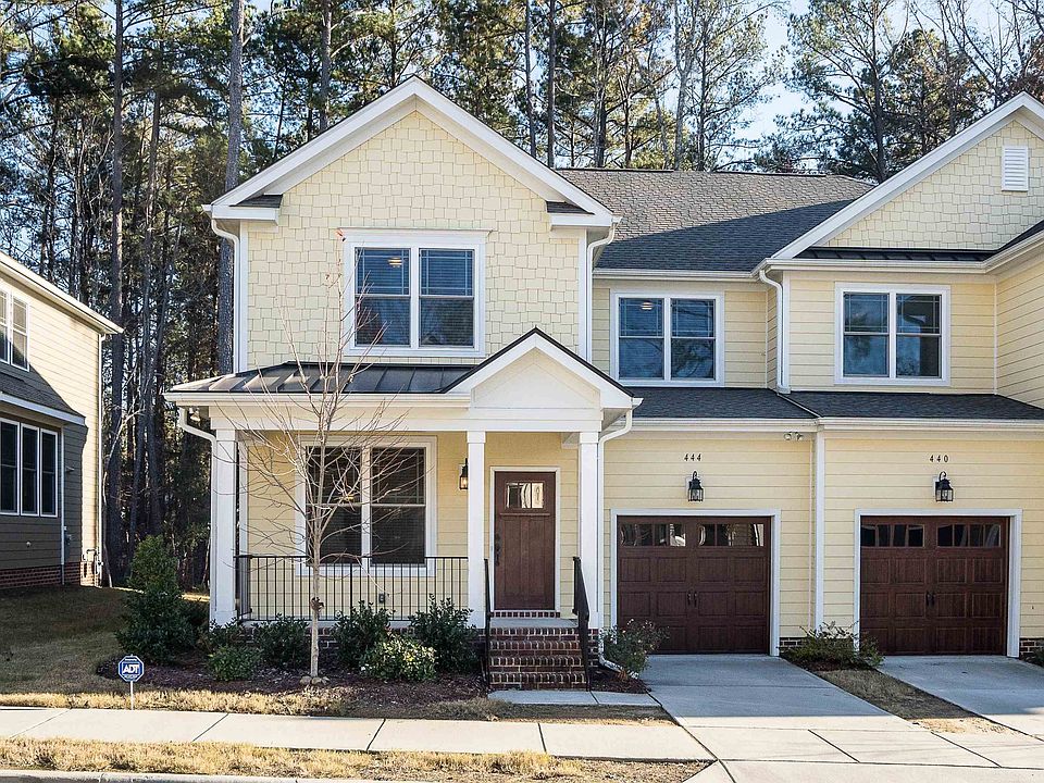 Highly desired, maintenance-free living at Burch Kove with tons of upgrades and a drive-in garage. 4 bedrooms, 3 full baths, plus a loft area. One bedroom and full bath on the first floor. Large open floorplan. Kitchen with granite, stainless, & upgraded cabinets. Open and bright Family room/Dining area. Master w/large walk-in closet and bath with dual vanity. Private backyard with deck. Walking distance to Seawell Elementary & Smith Middle schools. Community pool, playground, and dog park. Move-in ready, freshly painted, and very energy efficient. Nearby shopping, UNC Healthcare, and transportation.