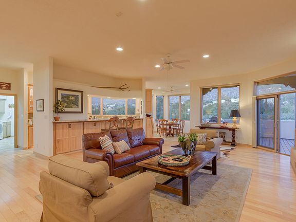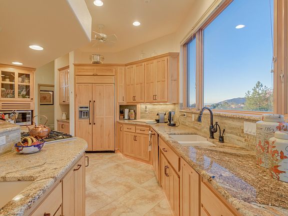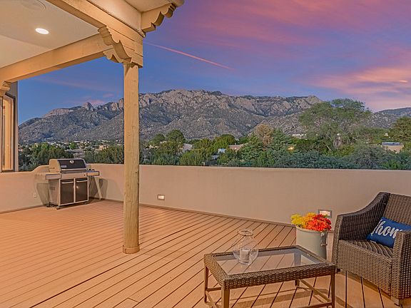 Sandia Heights living at the best! Enjoy the breathtaking mountain views from inside and outside. The high-ceilinged kitchen features stainless steel appliances, gas cooktop, granite counters, and ample counter & cabinet space. The master suite and two bedrooms are situated on the main floor of the home. Be sure to take a look at the enormous master closet. The flex space off the master has many uses and isn't included in the total square footage of the home. Two additional bedrooms are located downstairs, along with an office, great room, and bar. The multi-generational quarters has direct access to a lovely shady patio area complete with waterfall, fireplace and grill. This bright and open home is ready for you. Oversized garage on the ground floor is a car enthusiast's dream.