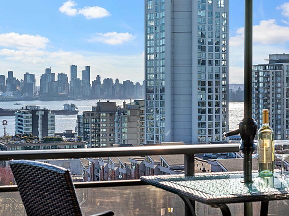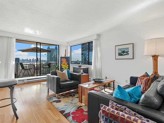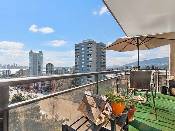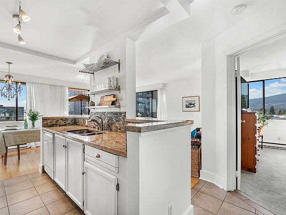 Take in the 270 DEGREE VIEWS of Burrard Inlet, Lions Gate Bridge, Vancouver's skyline & the North Shore Mountains from this sun-kissed, SW corner unit. This renovated 1-bdrm suite offers 693SF of refined living space featuring the CONVENIENCE OF IN-SUITE LAUNDRY, a rarity in the building. The open-concept kitchen, adorned with granite counters & a raised breakfast bar, seamlessly merges with the dining & living areas, all boasting the mesmerizing views. The expansive master bdrm leads to a walk-through closet. Beyond the unit, revel in the pride of ownership evident in this well-managed, meticulously maintained building with a robust CRF. Residents can take advantage of the park-like common area yard, bask in the sun-drenched outdoor pool or pursue hobbies in the workshop. NO PETS.